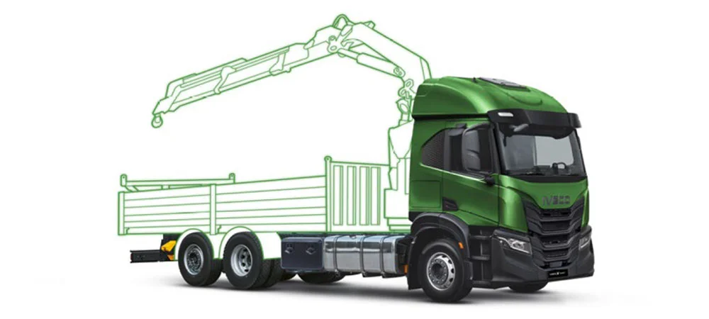На IVECO X-Way можна встановити будь-який тип крана. Надійність і модульна концепція автомобіля дозволяє встановлювати крани за кабіною, посередині та задній частині автомобіля без шкоди для стійкості.