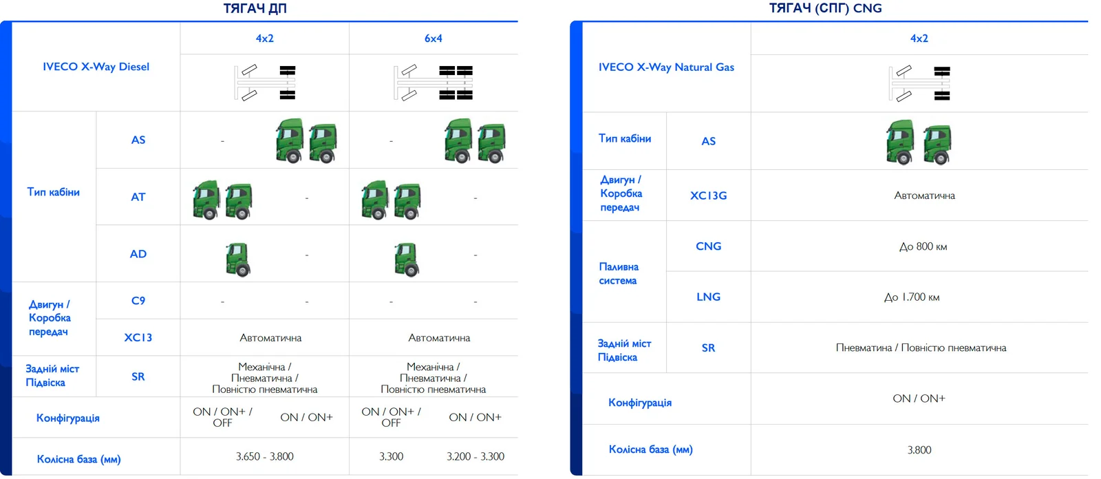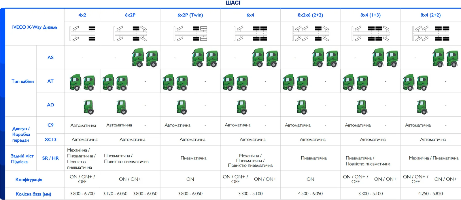 Тягачі IVECO X-Way поєднують в собі двигун XC13 з найкращою паливною ефективністю, нові функції ADAS і нову кабіну AS, повністю перероблену під потреби водія. Ці характеристики дають вам впевненість у тому, що ви з легкістю подолаєте "останню милю" та складні умови на будівельних майданчиках під час доставки, забезпечуючи при цьому високу продуктивність, безпеку та відмінну сукупну вартість володіння.